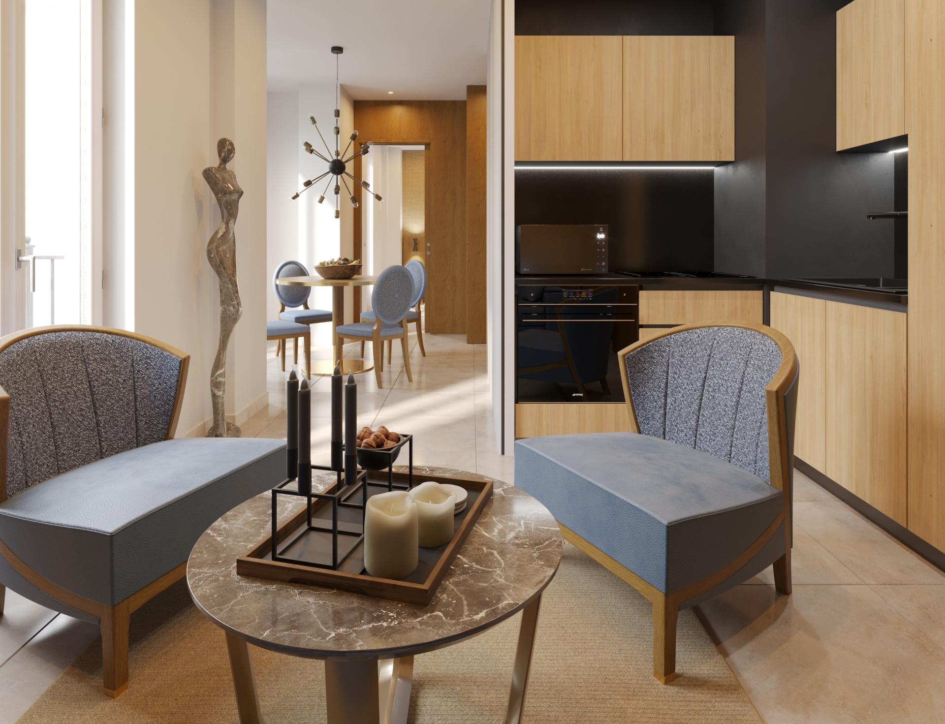 Questi appartamenti dal lusso discreto e senza tempo sono perfetti per un soggiorno glamour, dedicato allo shopping o per viaggi di lavoro. Caratterizzati da comfort moderni e tonalità terracotta, ocra o blu petrolio, comprendono un soggiorno con cucina americana attrezzata e una camera matrimoniale.